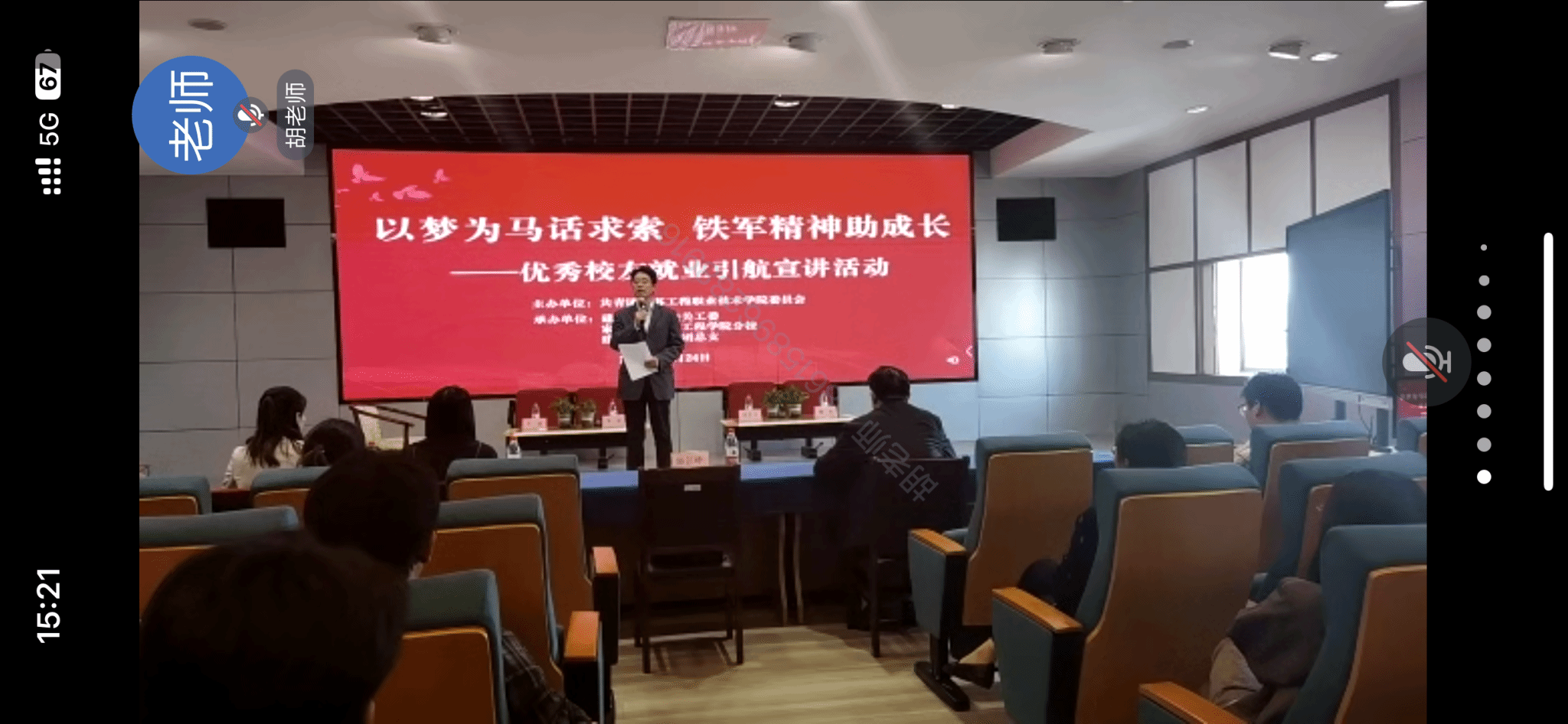 为进一步促进家校协同联动育人工作,培育学生正确的职业观、择业观,4月24日,家长学校建筑工程学院分校举办以“以梦为马话求索,铁军精神助成长”为主题的优秀校友就业引航线上线下宣讲活动。校党委委员、副校长郭江峰,校团委副书记沈雯,校关工委宣讲团成员、建筑工程学院关工委常务主任庄志新,建筑工程学院党总支书记、家长学校建筑工程学院分校校长白林,辅导员、家长、学生代表参加了本次活动。活动由学院团总支书记陆璐主持。