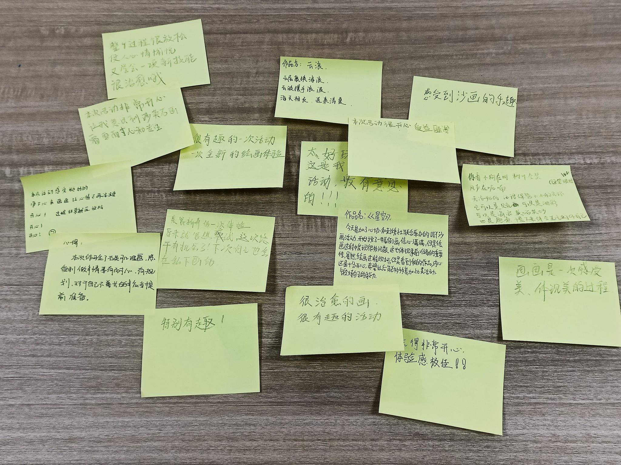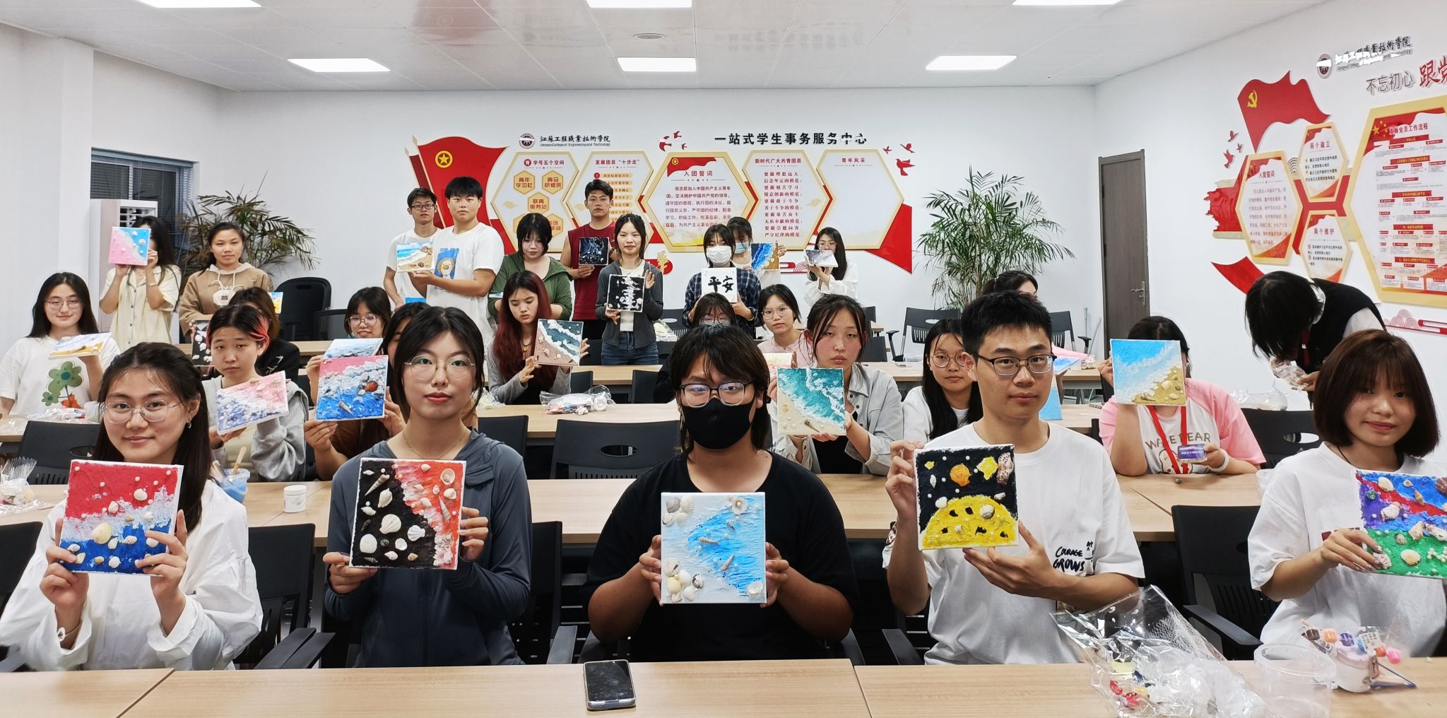本期创意绘画内容为沙滩贝壳肌理画。活动中,同学们将丙烯颜料和石英砂进行调和,用刮刀作笔,在画板上刮出各种纵横交错、凹凸不平的纹理,用丙烯颜料在富有肌理感的画面上绘制图案,最后粘贴上贝壳以及珍珠装饰作为点缀。经过大家的辛勤创作,一幅幅充满创意和个性的肌理画作品呈现在大家眼前,这些作品如同心灵之镜,投射出各自内心的情感世界。活动结束后,同学们纷纷分享感受,如:“这次活动让自己感到很治愈”、“这是一次全新的绘画体验”、“下次还想参加这样的活动”等等。