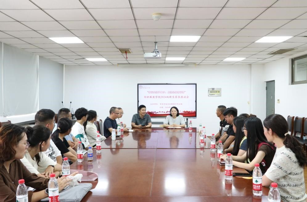 随后,家长分校在强毅楼604召开了2024级迎新家长座谈会。学院党总支书记夏爱萍、副书记刘桂阳、副院长魏振乾、洪杰以及27位受邀新生和家长出席了座谈会。座谈会上,夏爱萍介绍了学校成立家长学校的目的和愿望,讲解了学校和学院的历史沿革,展示了我院优秀师资力量和高水平的教学平台,并就学生在校情况、生涯规划、能力提升、升学就业等家长关心的问题作了详细解答。她希望家长们要与班主任加强联系,家校协同,共同做好学生的成长关怀与教育。座谈会的最后,学院为每一位新生及家长送上了精美礼品。