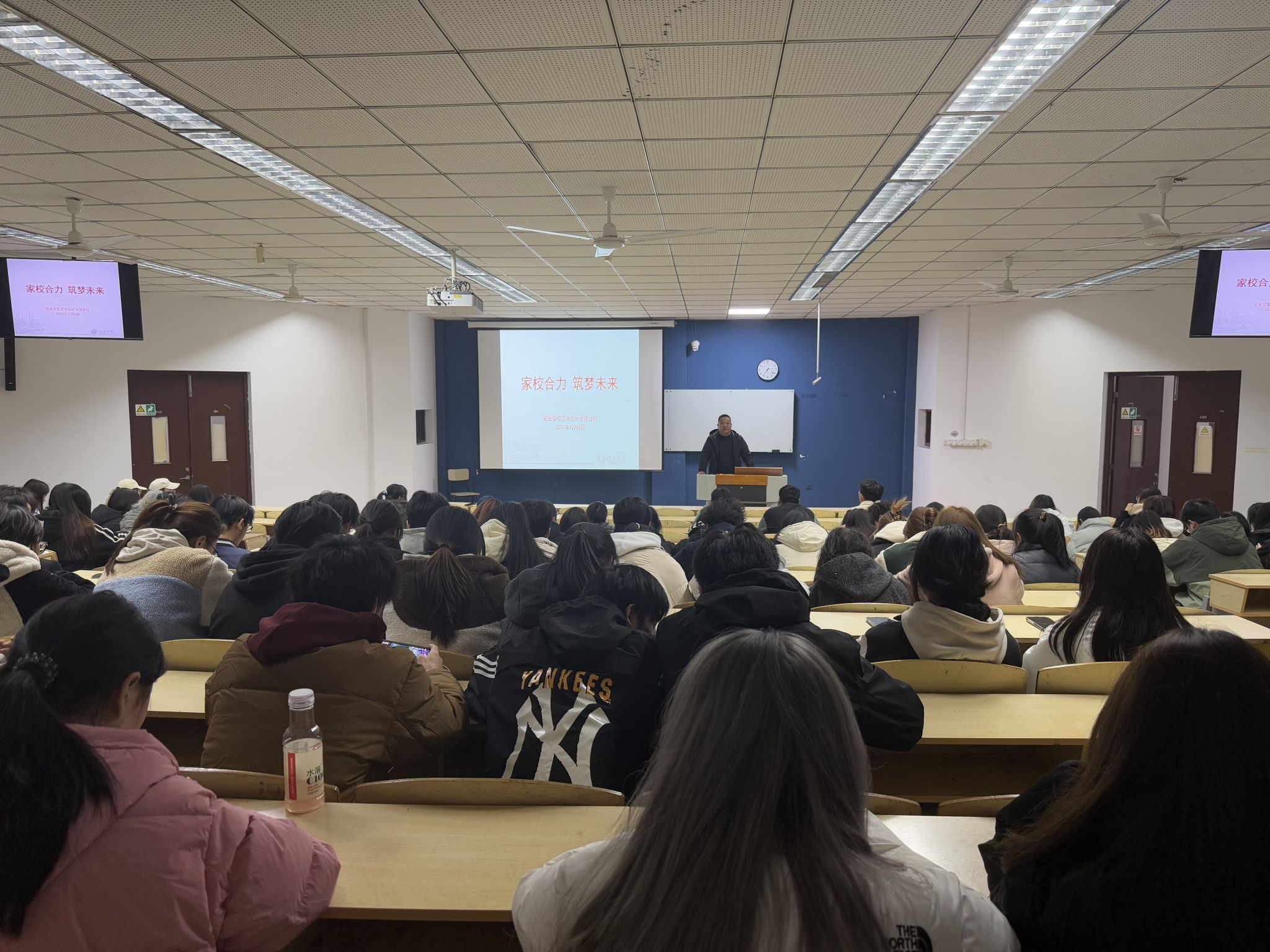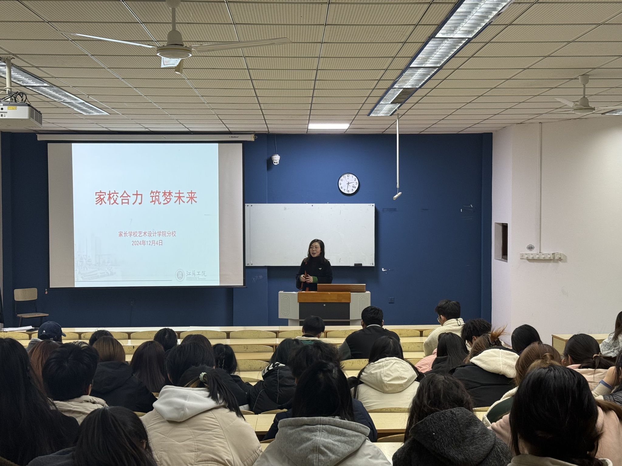 为深化家校合作,共同关注并促进学生全面发展,家长学校艺术设计学院分校于12月4日在致用楼200举办家长课堂活动。艺术设计学院党总支书记、家长学校艺术设计学院分校校长彭曼,23产品一二蔡思嘉学生父亲、南通隆盛化工有限公司负责人蔡春龙,辅导员高扬、胡伟鹏,以及100余名学生参加活动。