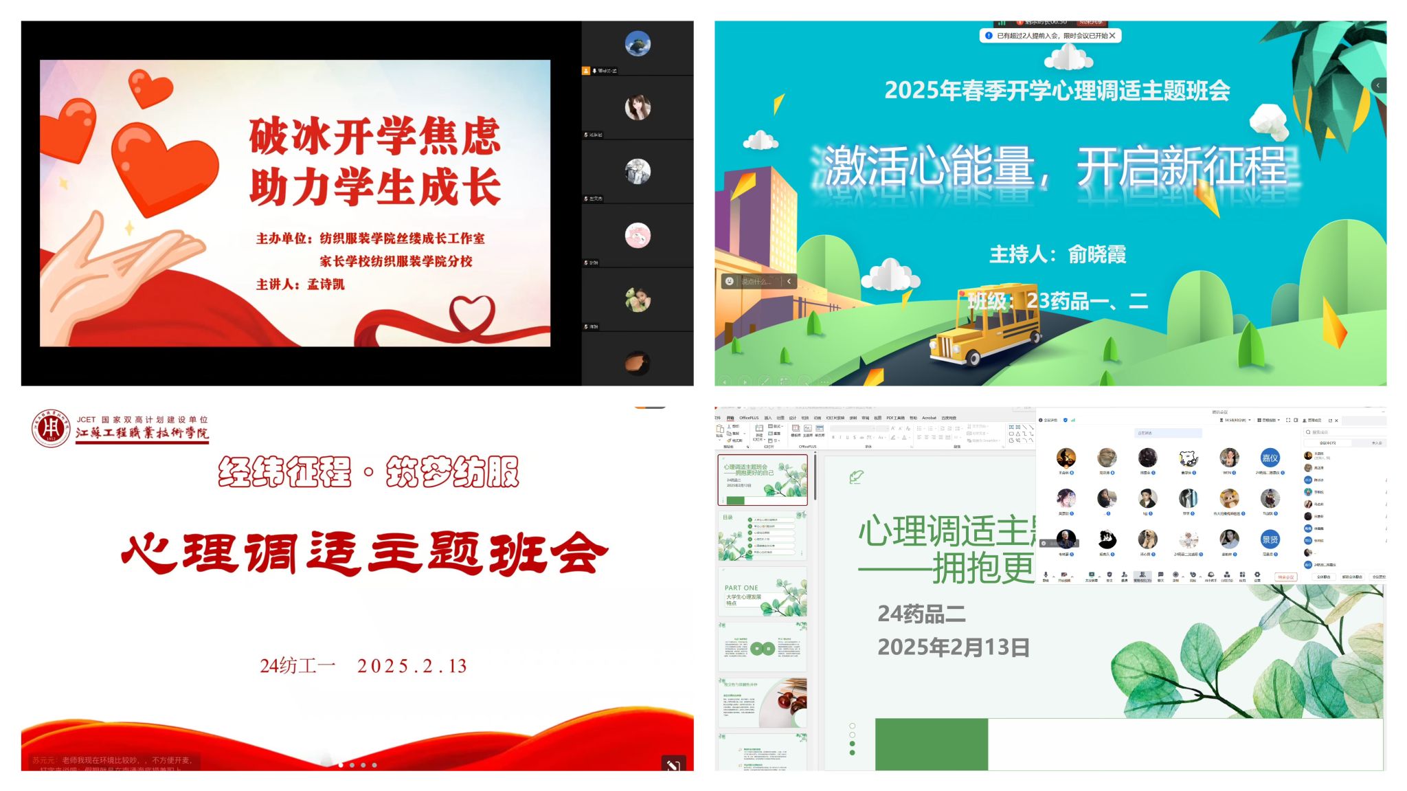 为帮助学生及家长更好地适应寒假后的学习生活节奏,以积极健康的心理状态迎接新学期,2月8日-2月14日,纺织服装学院积极响应校学工部号召,由丝缕成长工作室联合家长学校,面向全院23级、24级学生及家长开展了寒假开学前心理调适线上班会课。