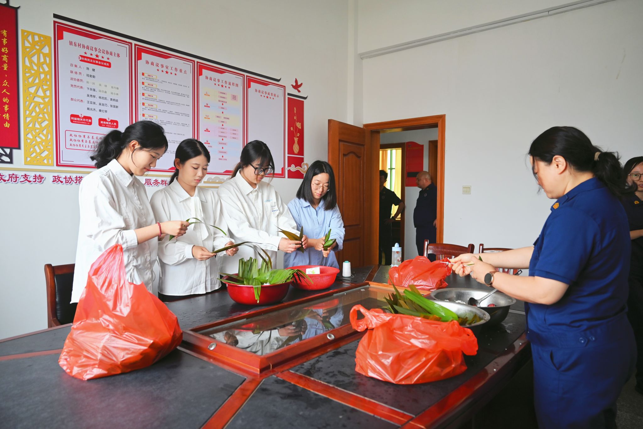 五彩编织绳互动现场,学生和家长、村民摊开红、黄、蓝、白、黑五色丝线,手把手教村民编结端午彩绳。“先绕线打平结,再把五色线交错拉紧……”学生们指尖翻飞间,编好的彩绳有着“端午戴五彩,一年都安康”的寓意,学生与村民凑在一起琢磨绳结的画面,让传统民俗在代际传递中满是温情。