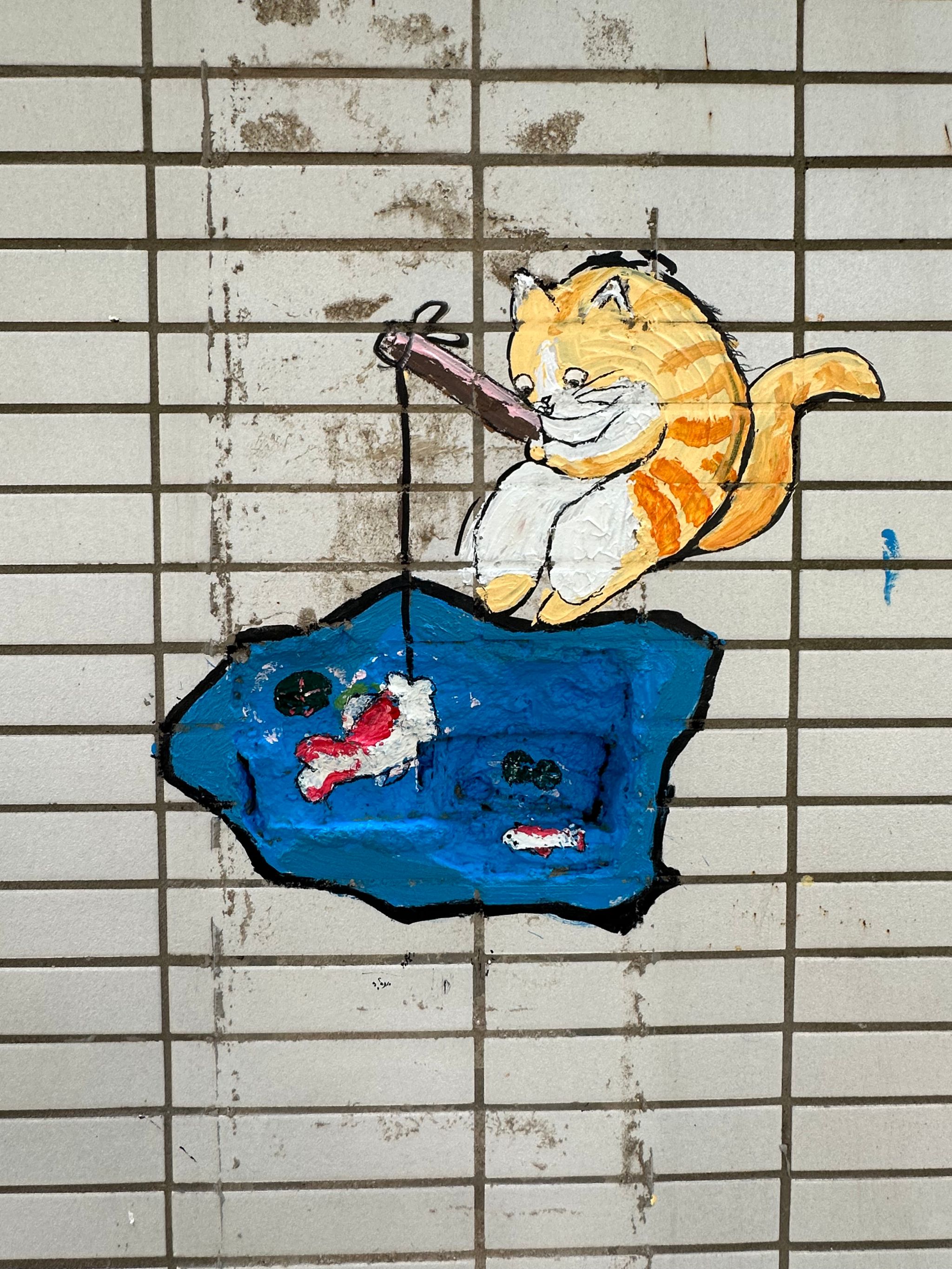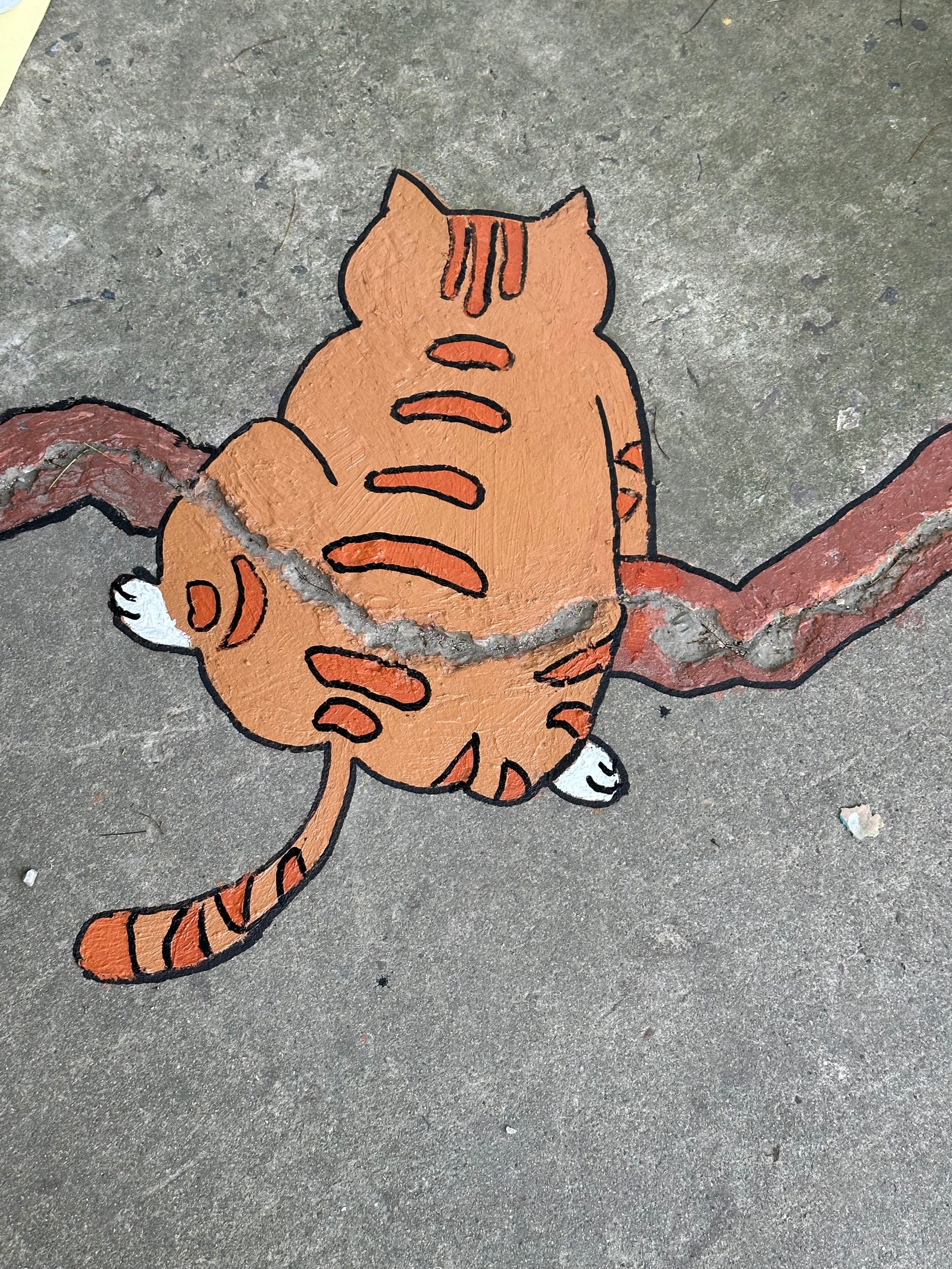 在为期两周的创作中,学生们采用“环境介入式艺术”理念,巧妙结合建筑破损形态进行创作:青苔蔓延的墙角被绘制成《绿野仙踪》森林入口,脱落的墙皮下“藏”着钓鱼的小猫,水泥台阶裂缝中“生长”出会发光的荧光蘑菇,地面的裂缝变成了猫咪的秋千,引得往来同学驻足打卡。在活动期间邀请24艺术设计一、二班徐艺丹爸爸亲临创作现场,让艺术教育的成果得以直观呈现,增强了家校共育的纽带。徐艺丹父亲饶有兴致地观看了女儿及同学们的现场创作,对同学们将破损转化为艺术的巧思赞不绝口,他表示:“看到孩子们用专业所学美化生活空间,发现并创造美,作为家长感到非常欣慰和自豪。”