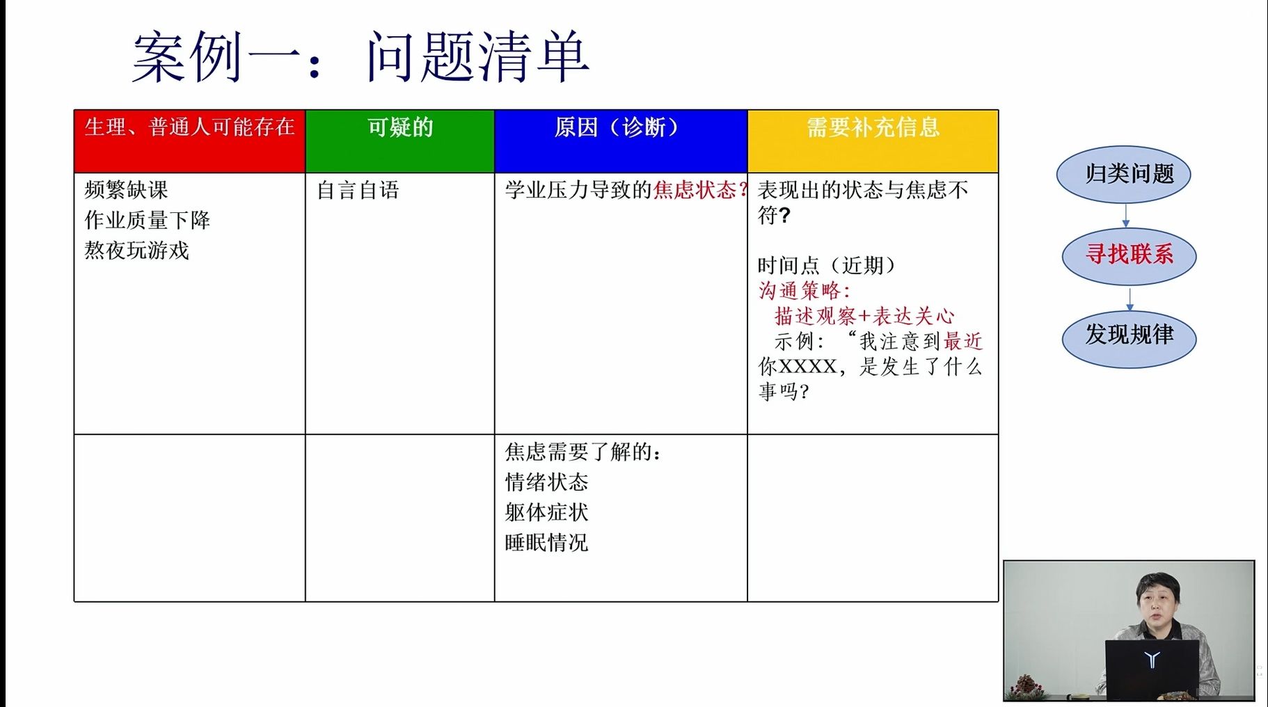 心理健康教育与咨询中心主任王健的案例研讨将培训推向高潮。针对工作中常见的3个典型案例以及班主任的困惑,她进行深度心理剖析,从问题清单到沟通示例、认知重建示例,帮助辅导员和班主任更好地跟学生及家长建立信任关系,提升沟通技巧。