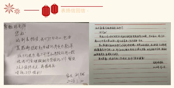 表扬信寄出后,学院陆续收到家长们的暖心回复与亲笔回信,字里行间洋溢着喜悦之情与对学校工作的高度认可。家长们纷纷表示,将以这份荣誉为契机,进一步加强与学校的沟通协作,携手为孩子的全面成长保驾护航。