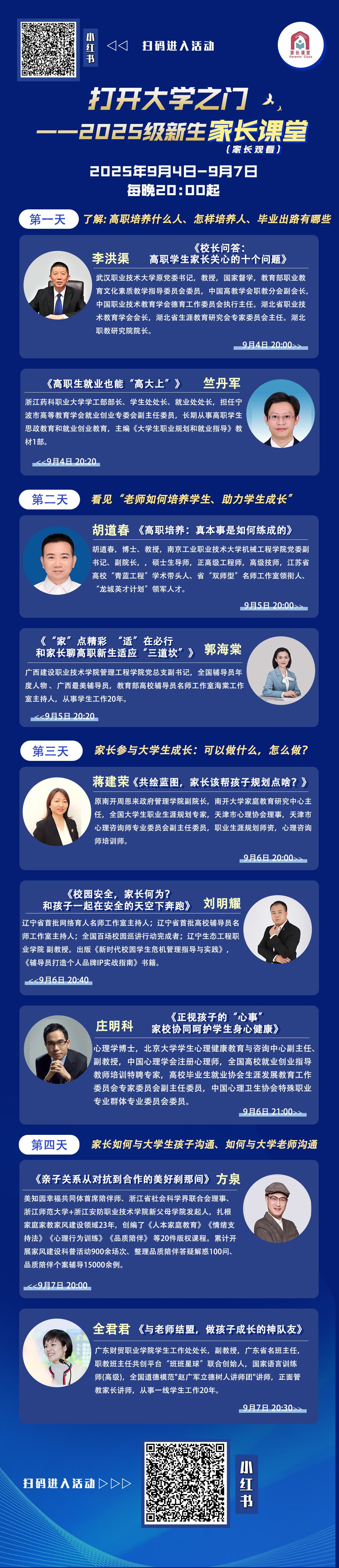 教育,从来不是孤军奋战。您负责家的温暖,我们负责点亮前程。只有我们真正携手,孩子才能走得更稳、更远、更自信。为帮助您更好地了解孩子的大学学习与成长环境,共同助力孩子顺利适应大学生活、规划未来方向,天下学工特别策划了“打开大学之门”系列家长课堂。现将具体安排通知如下: